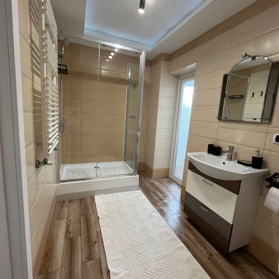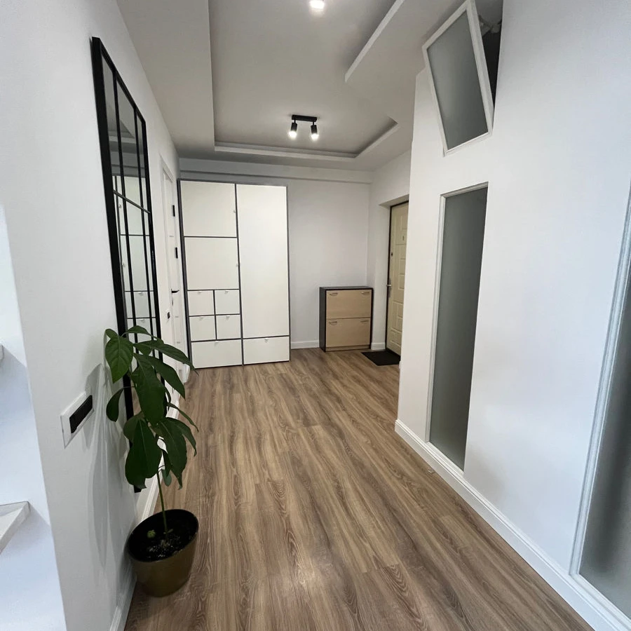 Apartamentul este complet renovat, luminos și spațios, cu o vedere frumoasă asupra orașului.
